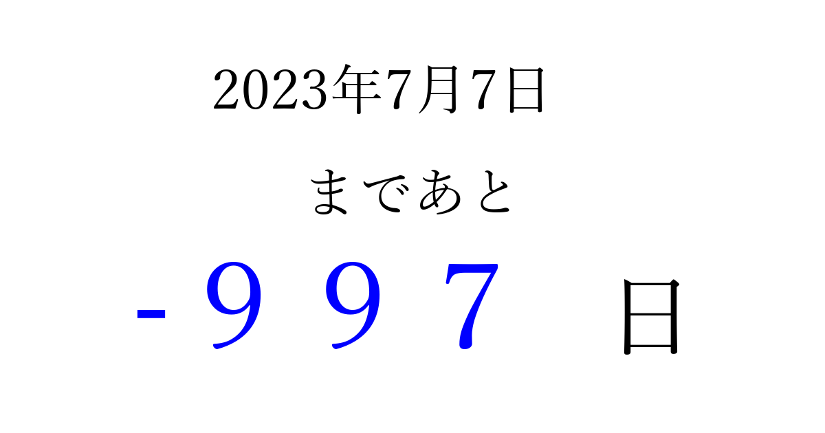2023年7月7日(金)は もう 000 日過ぎました 追加すると、トップページからすぐ選べるようになります ※2026/03/30現在の結果です。 最新の状態に更新する ↓シェアして、タイムライン上にカウントダウンを表示しよう!↓ 📤 この結果を共有する Tweet シェア Threads Bluesky 別の日付でカウントダウン 2023年7月のカレンダー このページをブックマークに追加すると、いつでもカウントダウンを確認できます。 (PC: Ctrl+D / Mac: ⌘+D) hitome-notes.comでは以下のページも運営しています。 指定日と期間から日付を計算 | ガチャ確率計算・シミュレーション | プライバシー・ポリシー 運営者:Avocado