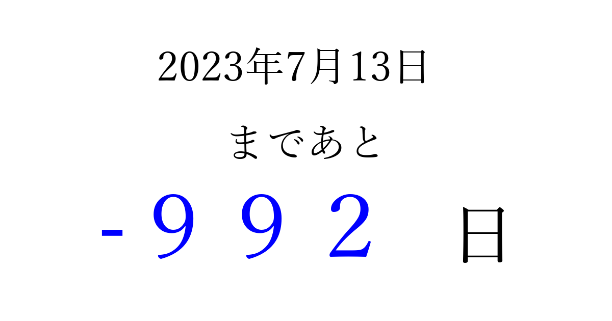 2023年7月13日(木)は もう 000 日過ぎました 追加すると、トップページからすぐ選べるようになります ※2026/03/31現在の結果です。 最新の状態に更新する ↓シェアして、タイムライン上にカウントダウンを表示しよう!↓ 📤 この結果を共有する Tweet シェア Threads Bluesky 別の日付でカウントダウン 2023年7月のカレンダー このページをブックマークに追加すると、いつでもカウントダウンを確認できます。 (PC: Ctrl+D / Mac: ⌘+D) hitome-notes.comでは以下のページも運営しています。 指定日と期間から日付を計算 | ガチャ確率計算・シミュレーション | プライバシー・ポリシー 運営者:Avocado