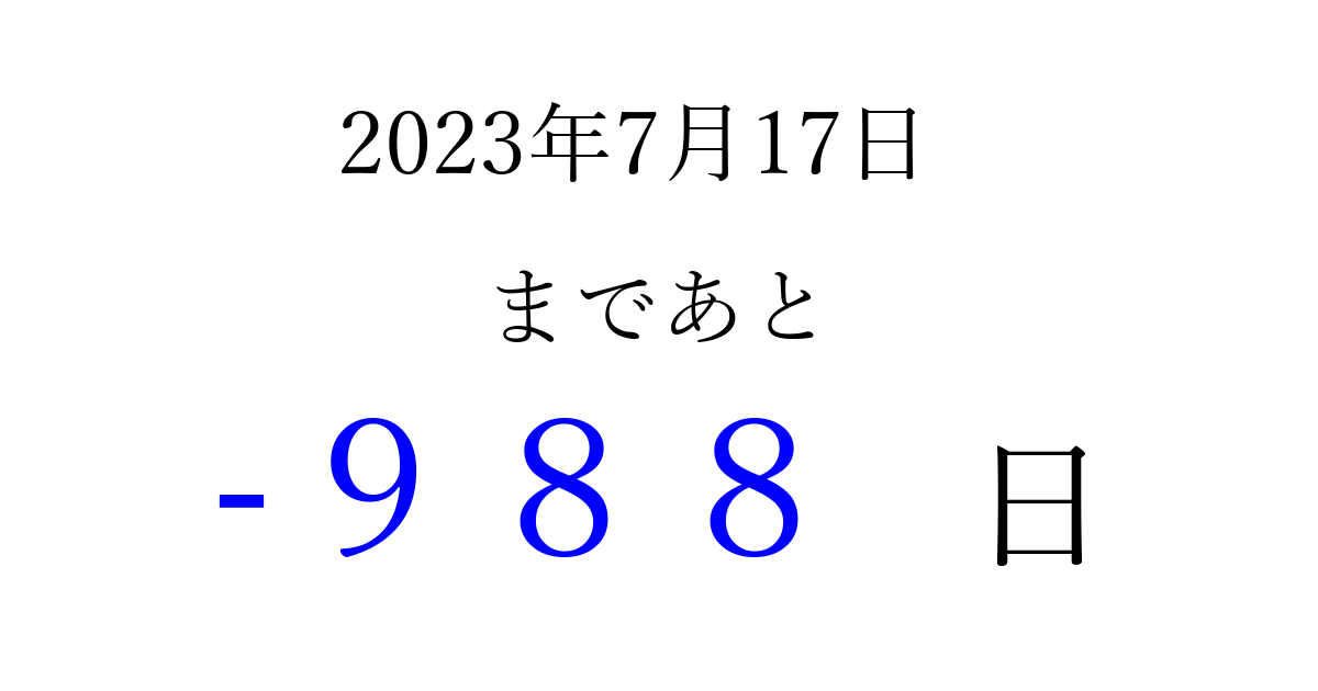 2023年7月17日(月)は もう 000 日過ぎました 追加すると、トップページからすぐ選べるようになります ※2026/03/31現在の結果です。 最新の状態に更新する ↓シェアして、タイムライン上にカウントダウンを表示しよう!↓ 📤 この結果を共有する Tweet シェア Threads Bluesky 別の日付でカウントダウン 2023年7月のカレンダー このページをブックマークに追加すると、いつでもカウントダウンを確認できます。 (PC: Ctrl+D / Mac: ⌘+D) hitome-notes.comでは以下のページも運営しています。 指定日と期間から日付を計算 | ガチャ確率計算・シミュレーション | プライバシー・ポリシー 運営者:Avocado