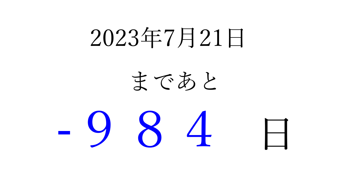 2023年7月21日(金)は もう 000 日過ぎました 追加すると、トップページからすぐ選べるようになります ※2026/03/31現在の結果です。 最新の状態に更新する ↓シェアして、タイムライン上にカウントダウンを表示しよう!↓ 📤 この結果を共有する Tweet シェア Threads Bluesky 別の日付でカウントダウン 2023年7月のカレンダー このページをブックマークに追加すると、いつでもカウントダウンを確認できます。 (PC: Ctrl+D / Mac: ⌘+D) hitome-notes.comでは以下のページも運営しています。 指定日と期間から日付を計算 | ガチャ確率計算・シミュレーション | プライバシー・ポリシー 運営者:Avocado