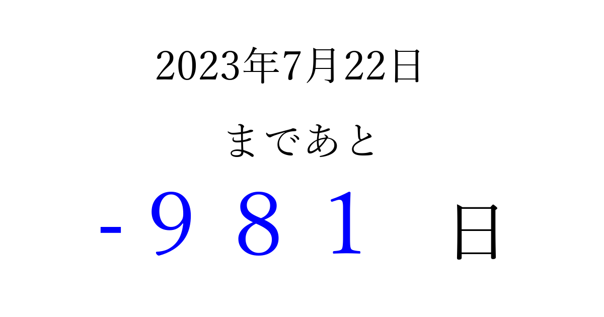 2023年7月22日(土)は もう 000 日過ぎました 追加すると、トップページからすぐ選べるようになります ※2026/03/29現在の結果です。 最新の状態に更新する ↓シェアして、タイムライン上にカウントダウンを表示しよう!↓ 📤 この結果を共有する Tweet シェア Threads Bluesky 別の日付でカウントダウン 2023年7月のカレンダー このページをブックマークに追加すると、いつでもカウントダウンを確認できます。 (PC: Ctrl+D / Mac: ⌘+D) hitome-notes.comでは以下のページも運営しています。 指定日と期間から日付を計算 | ガチャ確率計算・シミュレーション | プライバシー・ポリシー 運営者:Avocado