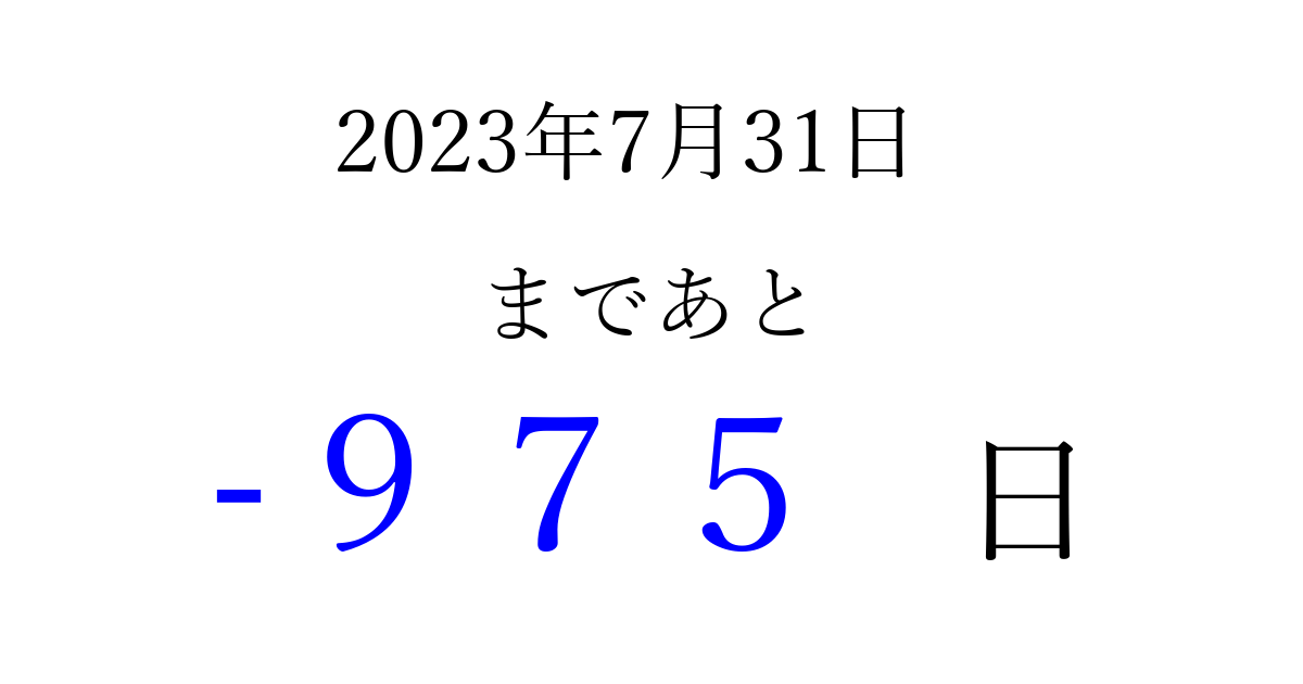 2023年7月31日(月)は もう 000 日過ぎました 追加すると、トップページからすぐ選べるようになります ※2026/04/01現在の結果です。 最新の状態に更新する ↓シェアして、タイムライン上にカウントダウンを表示しよう!↓ 📤 この結果を共有する Tweet シェア Threads Bluesky 別の日付でカウントダウン 2023年7月のカレンダー このページをブックマークに追加すると、いつでもカウントダウンを確認できます。 (PC: Ctrl+D / Mac: ⌘+D) hitome-notes.comでは以下のページも運営しています。 指定日と期間から日付を計算 | ガチャ確率計算・シミュレーション | プライバシー・ポリシー 運営者:Avocado