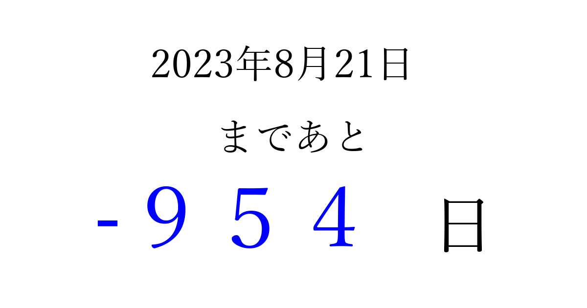 2023年8月21日(月)は もう 000 日過ぎました 追加すると、トップページからすぐ選べるようになります ※2026/04/01現在の結果です。 最新の状態に更新する ↓シェアして、タイムライン上にカウントダウンを表示しよう!↓ 📤 この結果を共有する Tweet シェア Threads Bluesky 別の日付でカウントダウン 2023年8月のカレンダー このページをブックマークに追加すると、いつでもカウントダウンを確認できます。 (PC: Ctrl+D / Mac: ⌘+D) hitome-notes.comでは以下のページも運営しています。 指定日と期間から日付を計算 | ガチャ確率計算・シミュレーション | プライバシー・ポリシー 運営者:Avocado