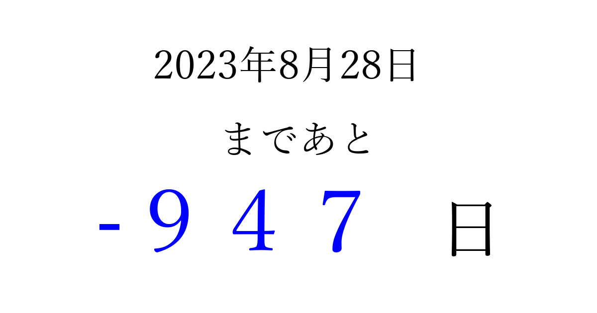 2023年8月28日(月)は もう 000 日過ぎました 追加すると、トップページからすぐ選べるようになります ※2026/04/01現在の結果です。 最新の状態に更新する ↓シェアして、タイムライン上にカウントダウンを表示しよう!↓ 📤 この結果を共有する Tweet シェア Threads Bluesky 別の日付でカウントダウン 2023年8月のカレンダー このページをブックマークに追加すると、いつでもカウントダウンを確認できます。 (PC: Ctrl+D / Mac: ⌘+D) hitome-notes.comでは以下のページも運営しています。 指定日と期間から日付を計算 | ガチャ確率計算・シミュレーション | プライバシー・ポリシー 運営者:Avocado
