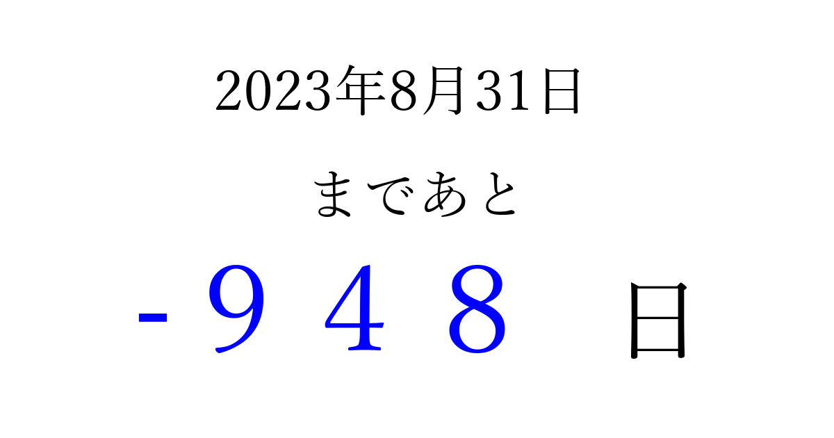 2023年8月31日(木)は もう 000 日過ぎました 追加すると、トップページからすぐ選べるようになります ※2026/04/05現在の結果です。 最新の状態に更新する ↓シェアして、タイムライン上にカウントダウンを表示しよう!↓ 📤 この結果を共有する Tweet シェア Threads Bluesky 別の日付でカウントダウン 2023年8月のカレンダー このページをブックマークに追加すると、いつでもカウントダウンを確認できます。 (PC: Ctrl+D / Mac: ⌘+D) hitome-notes.comでは以下のページも運営しています。 指定日と期間から日付を計算 | ガチャ確率計算・シミュレーション | プライバシー・ポリシー 運営者:Avocado