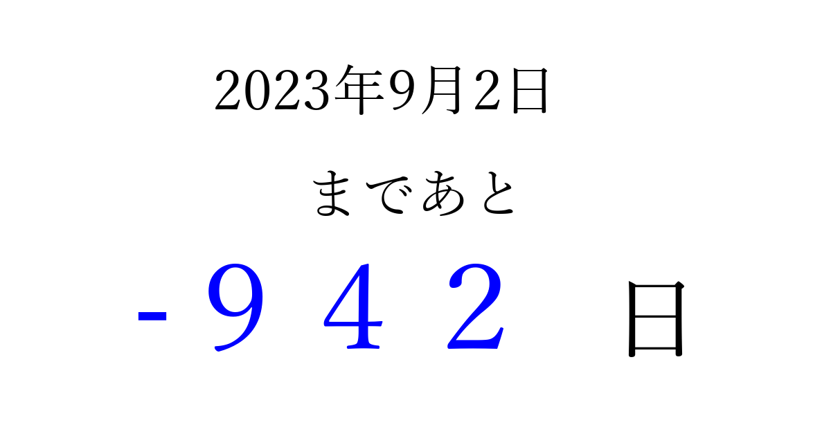 2023年9月2日(土)は もう 000 日過ぎました 追加すると、トップページからすぐ選べるようになります ※2026/04/01現在の結果です。 最新の状態に更新する ↓シェアして、タイムライン上にカウントダウンを表示しよう!↓ 📤 この結果を共有する Tweet シェア Threads Bluesky 別の日付でカウントダウン 2023年9月のカレンダー このページをブックマークに追加すると、いつでもカウントダウンを確認できます。 (PC: Ctrl+D / Mac: ⌘+D) hitome-notes.comでは以下のページも運営しています。 指定日と期間から日付を計算 | ガチャ確率計算・シミュレーション | プライバシー・ポリシー 運営者:Avocado