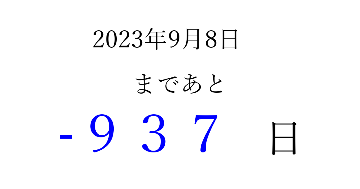 2023年9月8日(金)は もう 000 日過ぎました 追加すると、トップページからすぐ選べるようになります ※2026/04/02現在の結果です。 最新の状態に更新する ↓シェアして、タイムライン上にカウントダウンを表示しよう!↓ 📤 この結果を共有する Tweet シェア Threads Bluesky 別の日付でカウントダウン 2023年9月のカレンダー このページをブックマークに追加すると、いつでもカウントダウンを確認できます。 (PC: Ctrl+D / Mac: ⌘+D) hitome-notes.comでは以下のページも運営しています。 指定日と期間から日付を計算 | ガチャ確率計算・シミュレーション | プライバシー・ポリシー 運営者:Avocado