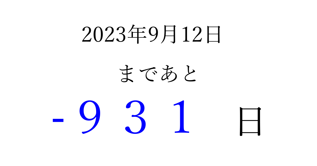 2023年9月12日(火)は もう 000 日過ぎました 追加すると、トップページからすぐ選べるようになります ※2026/03/31現在の結果です。 最新の状態に更新する ↓シェアして、タイムライン上にカウントダウンを表示しよう!↓ 📤 この結果を共有する Tweet シェア Threads Bluesky 別の日付でカウントダウン 2023年9月のカレンダー このページをブックマークに追加すると、いつでもカウントダウンを確認できます。 (PC: Ctrl+D / Mac: ⌘+D) hitome-notes.comでは以下のページも運営しています。 指定日と期間から日付を計算 | ガチャ確率計算・シミュレーション | プライバシー・ポリシー 運営者:Avocado