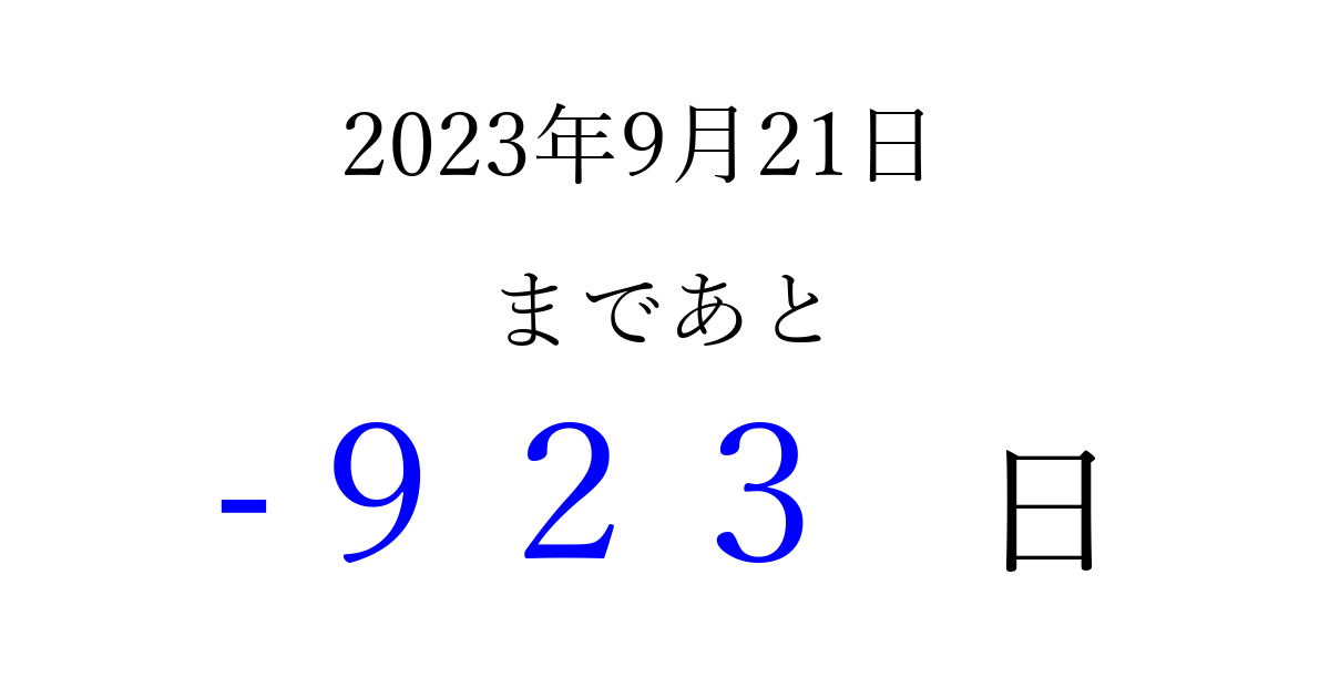 2023年9月21日(木)は もう 000 日過ぎました 追加すると、トップページからすぐ選べるようになります ※2026/04/01現在の結果です。 最新の状態に更新する ↓シェアして、タイムライン上にカウントダウンを表示しよう!↓ 📤 この結果を共有する Tweet シェア Threads Bluesky 別の日付でカウントダウン 2023年9月のカレンダー このページをブックマークに追加すると、いつでもカウントダウンを確認できます。 (PC: Ctrl+D / Mac: ⌘+D) hitome-notes.comでは以下のページも運営しています。 指定日と期間から日付を計算 | ガチャ確率計算・シミュレーション | プライバシー・ポリシー 運営者:Avocado