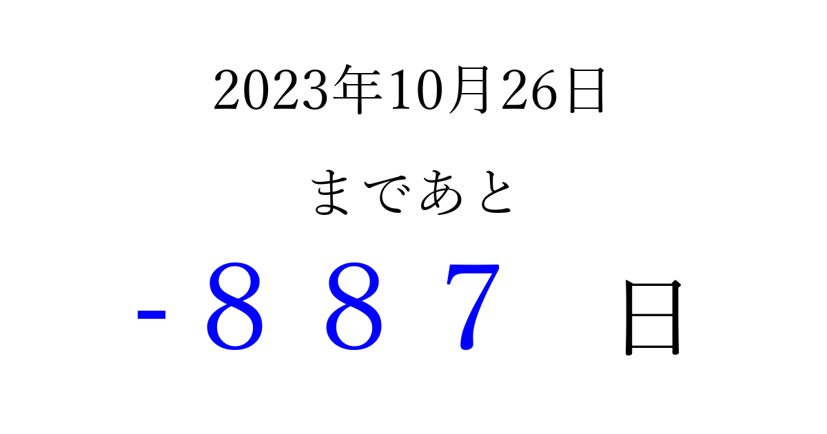 2023年10月26日(木)は もう 000 日過ぎました 追加すると、トップページからすぐ選べるようになります ※2026/03/31現在の結果です。 最新の状態に更新する ↓シェアして、タイムライン上にカウントダウンを表示しよう!↓ 📤 この結果を共有する Tweet シェア Threads Bluesky 別の日付でカウントダウン 2023年10月のカレンダー このページをブックマークに追加すると、いつでもカウントダウンを確認できます。 (PC: Ctrl+D / Mac: ⌘+D) hitome-notes.comでは以下のページも運営しています。 指定日と期間から日付を計算 | ガチャ確率計算・シミュレーション | プライバシー・ポリシー 運営者:Avocado