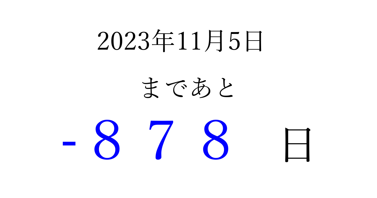 2023年11月5日(日)は もう 000 日過ぎました 追加すると、トップページからすぐ選べるようになります ※2026/04/01現在の結果です。 最新の状態に更新する ↓シェアして、タイムライン上にカウントダウンを表示しよう!↓ 📤 この結果を共有する Tweet シェア Threads Bluesky 別の日付でカウントダウン 2023年11月のカレンダー このページをブックマークに追加すると、いつでもカウントダウンを確認できます。 (PC: Ctrl+D / Mac: ⌘+D) hitome-notes.comでは以下のページも運営しています。 指定日と期間から日付を計算 | ガチャ確率計算・シミュレーション | プライバシー・ポリシー 運営者:Avocado