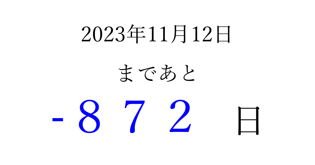 2023年11月12日(日)は もう 000 日過ぎました 追加すると、トップページからすぐ選べるようになります ※2026/04/02現在の結果です。 最新の状態に更新する ↓シェアして、タイムライン上にカウントダウンを表示しよう!↓ 📤 この結果を共有する Tweet シェア Threads Bluesky 別の日付でカウントダウン 2023年11月のカレンダー このページをブックマークに追加すると、いつでもカウントダウンを確認できます。 (PC: Ctrl+D / Mac: ⌘+D) hitome-notes.comでは以下のページも運営しています。 指定日と期間から日付を計算 | ガチャ確率計算・シミュレーション | プライバシー・ポリシー 運営者:Avocado