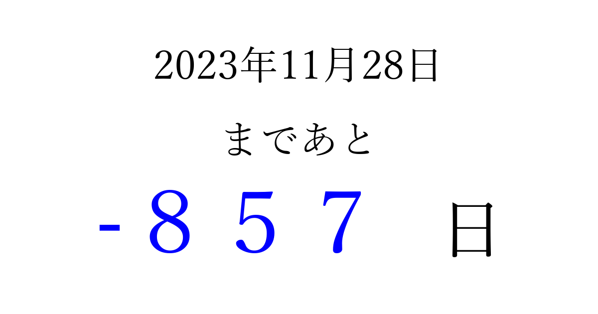 2023年11月28日(火)は もう 000 日過ぎました 追加すると、トップページからすぐ選べるようになります ※2026/04/03現在の結果です。 最新の状態に更新する ↓シェアして、タイムライン上にカウントダウンを表示しよう!↓ 📤 この結果を共有する Tweet シェア Threads Bluesky 別の日付でカウントダウン 2023年11月のカレンダー このページをブックマークに追加すると、いつでもカウントダウンを確認できます。 (PC: Ctrl+D / Mac: ⌘+D) hitome-notes.comでは以下のページも運営しています。 指定日と期間から日付を計算 | ガチャ確率計算・シミュレーション | プライバシー・ポリシー 運営者:Avocado