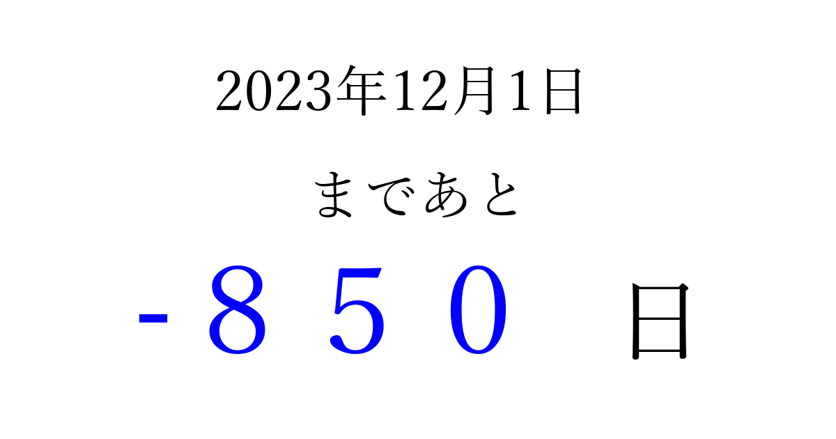 2023年12月1日(金)は もう 000 日過ぎました 追加すると、トップページからすぐ選べるようになります ※2026/03/30現在の結果です。 最新の状態に更新する ↓シェアして、タイムライン上にカウントダウンを表示しよう!↓ 📤 この結果を共有する Tweet シェア Threads Bluesky 別の日付でカウントダウン 2023年12月のカレンダー このページをブックマークに追加すると、いつでもカウントダウンを確認できます。 (PC: Ctrl+D / Mac: ⌘+D) hitome-notes.comでは以下のページも運営しています。 指定日と期間から日付を計算 | ガチャ確率計算・シミュレーション | プライバシー・ポリシー 運営者:Avocado