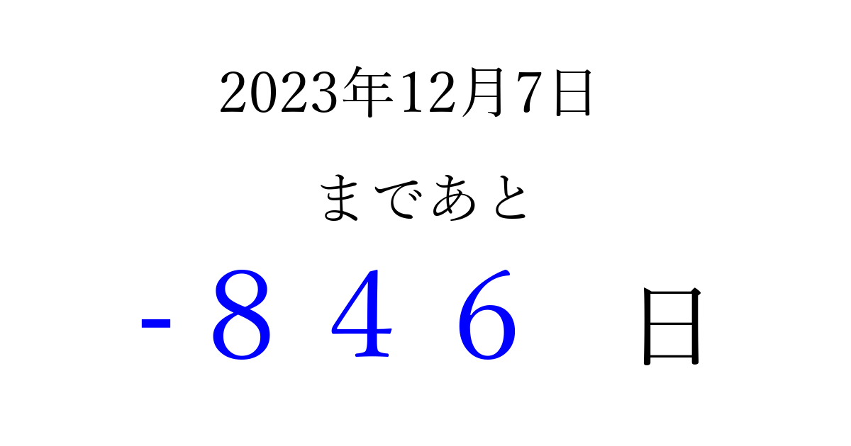 2023年12月7日(木)は もう 000 日過ぎました 追加すると、トップページからすぐ選べるようになります ※2026/04/01現在の結果です。 最新の状態に更新する ↓シェアして、タイムライン上にカウントダウンを表示しよう!↓ 📤 この結果を共有する Tweet シェア Threads Bluesky 別の日付でカウントダウン 2023年12月のカレンダー このページをブックマークに追加すると、いつでもカウントダウンを確認できます。 (PC: Ctrl+D / Mac: ⌘+D) hitome-notes.comでは以下のページも運営しています。 指定日と期間から日付を計算 | ガチャ確率計算・シミュレーション | プライバシー・ポリシー 運営者:Avocado