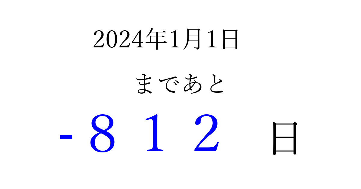 2024年1月1日(月)は もう 000 日過ぎました 追加すると、トップページからすぐ選べるようになります ※2026/03/23現在の結果です。 最新の状態に更新する ↓シェアして、タイムライン上にカウントダウンを表示しよう!↓ 📤 この結果を共有する Tweet シェア Threads Bluesky 別の日付でカウントダウン 2024年1月のカレンダー このページをブックマークに追加すると、いつでもカウントダウンを確認できます。 (PC: Ctrl+D / Mac: ⌘+D) hitome-notes.comでは以下のページも運営しています。 指定日と期間から日付を計算 | ガチャ確率計算・シミュレーション | プライバシー・ポリシー 運営者:Avocado