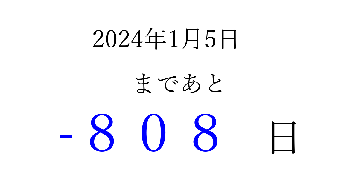 2024年1月5日(金)は もう 000 日過ぎました 追加すると、トップページからすぐ選べるようになります ※2026/03/23現在の結果です。 最新の状態に更新する ↓シェアして、タイムライン上にカウントダウンを表示しよう!↓ 📤 この結果を共有する Tweet シェア Threads Bluesky 別の日付でカウントダウン 2024年1月のカレンダー このページをブックマークに追加すると、いつでもカウントダウンを確認できます。 (PC: Ctrl+D / Mac: ⌘+D) hitome-notes.comでは以下のページも運営しています。 指定日と期間から日付を計算 | ガチャ確率計算・シミュレーション | プライバシー・ポリシー 運営者:Avocado