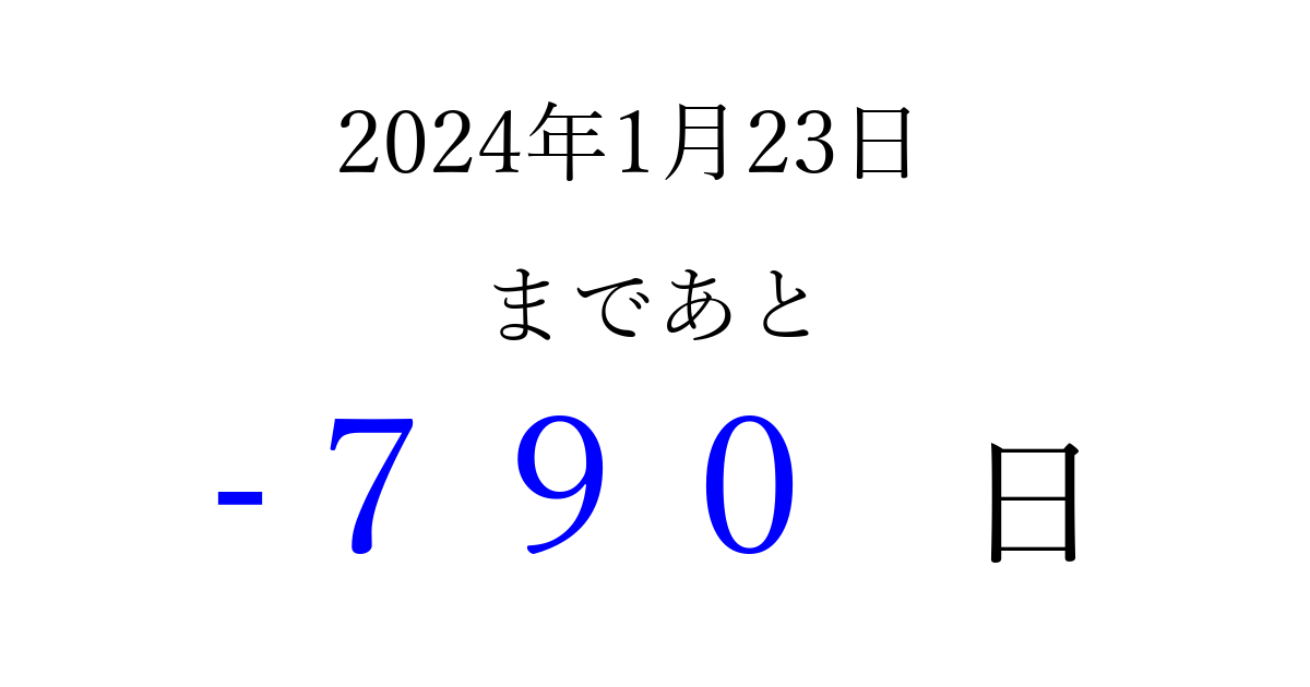 2024年1月23日(火)は もう 000 日過ぎました 追加すると、トップページからすぐ選べるようになります ※2026/03/23現在の結果です。 最新の状態に更新する ↓シェアして、タイムライン上にカウントダウンを表示しよう!↓ 📤 この結果を共有する Tweet シェア Threads Bluesky 別の日付でカウントダウン 2024年1月のカレンダー このページをブックマークに追加すると、いつでもカウントダウンを確認できます。 (PC: Ctrl+D / Mac: ⌘+D) hitome-notes.comでは以下のページも運営しています。 指定日と期間から日付を計算 | ガチャ確率計算・シミュレーション | プライバシー・ポリシー 運営者:Avocado