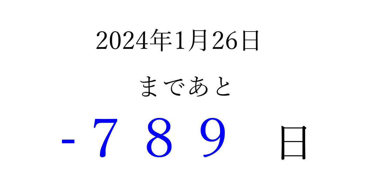2024年1月26日(金)は もう 000 日過ぎました 追加すると、トップページからすぐ選べるようになります ※2026/03/25現在の結果です。 最新の状態に更新する ↓シェアして、タイムライン上にカウントダウンを表示しよう!↓ 📤 この結果を共有する Tweet シェア Threads Bluesky 別の日付でカウントダウン 2024年1月のカレンダー このページをブックマークに追加すると、いつでもカウントダウンを確認できます。 (PC: Ctrl+D / Mac: ⌘+D) hitome-notes.comでは以下のページも運営しています。 指定日と期間から日付を計算 | ガチャ確率計算・シミュレーション | プライバシー・ポリシー 運営者:Avocado