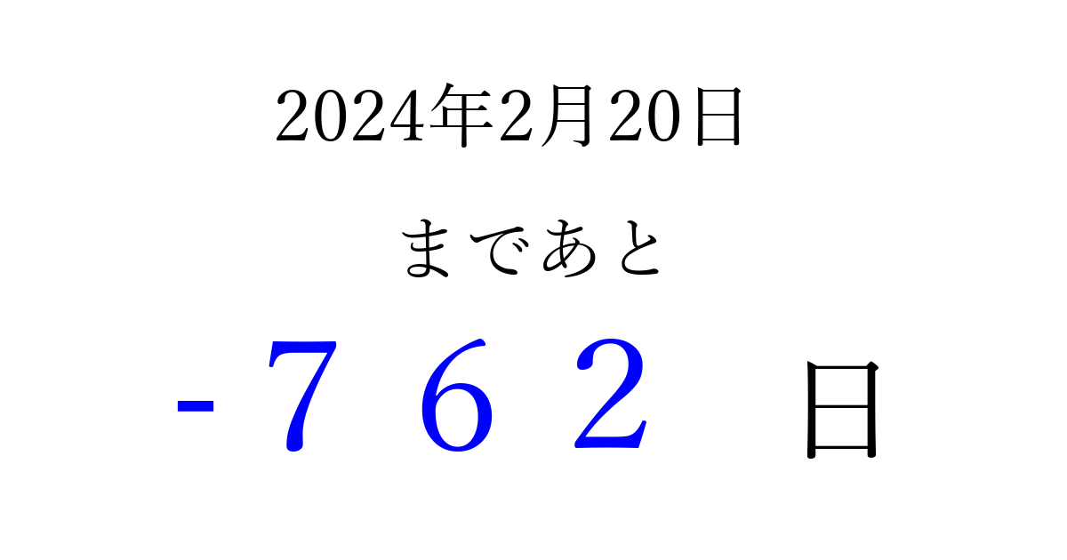2024年2月20日(火)は もう 000 日過ぎました 追加すると、トップページからすぐ選べるようになります ※2026/03/23現在の結果です。 最新の状態に更新する ↓シェアして、タイムライン上にカウントダウンを表示しよう!↓ 📤 この結果を共有する Tweet シェア Threads Bluesky 別の日付でカウントダウン 2024年2月のカレンダー このページをブックマークに追加すると、いつでもカウントダウンを確認できます。 (PC: Ctrl+D / Mac: ⌘+D) hitome-notes.comでは以下のページも運営しています。 指定日と期間から日付を計算 | ガチャ確率計算・シミュレーション | プライバシー・ポリシー 運営者:Avocado