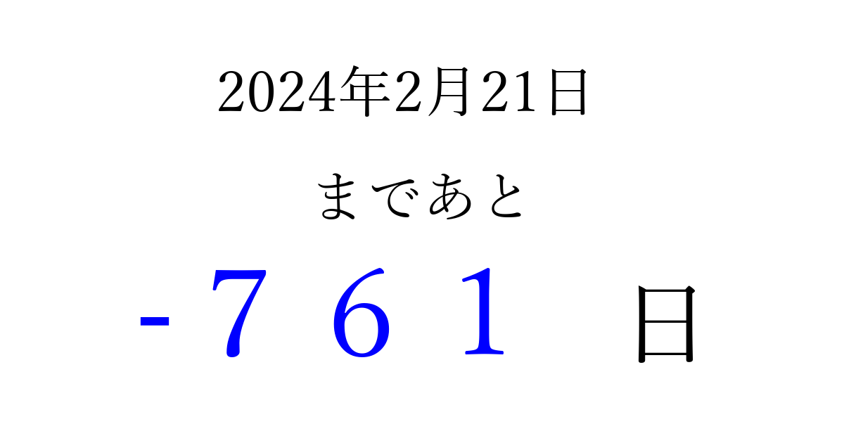 2024年2月21日(水)は もう 000 日過ぎました 追加すると、トップページからすぐ選べるようになります ※2026/03/23現在の結果です。 最新の状態に更新する ↓シェアして、タイムライン上にカウントダウンを表示しよう!↓ 📤 この結果を共有する Tweet シェア Threads Bluesky 別の日付でカウントダウン 2024年2月のカレンダー このページをブックマークに追加すると、いつでもカウントダウンを確認できます。 (PC: Ctrl+D / Mac: ⌘+D) hitome-notes.comでは以下のページも運営しています。 指定日と期間から日付を計算 | ガチャ確率計算・シミュレーション | プライバシー・ポリシー 運営者:Avocado