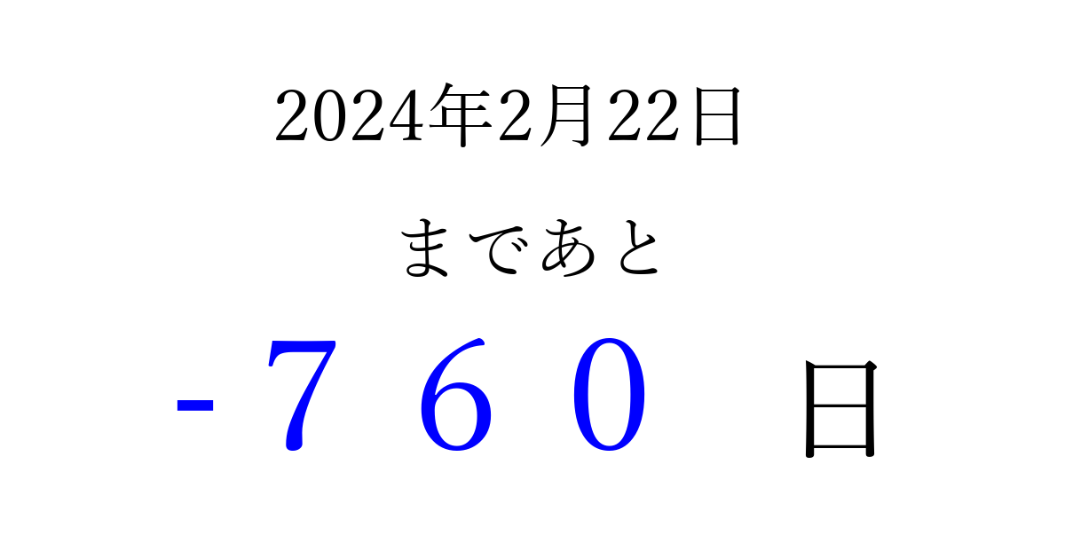 2024年2月22日(木)は もう 000 日過ぎました 追加すると、トップページからすぐ選べるようになります ※2026/03/23現在の結果です。 最新の状態に更新する ↓シェアして、タイムライン上にカウントダウンを表示しよう!↓ 📤 この結果を共有する Tweet シェア Threads Bluesky 別の日付でカウントダウン 2024年2月のカレンダー このページをブックマークに追加すると、いつでもカウントダウンを確認できます。 (PC: Ctrl+D / Mac: ⌘+D) hitome-notes.comでは以下のページも運営しています。 指定日と期間から日付を計算 | ガチャ確率計算・シミュレーション | プライバシー・ポリシー 運営者:Avocado