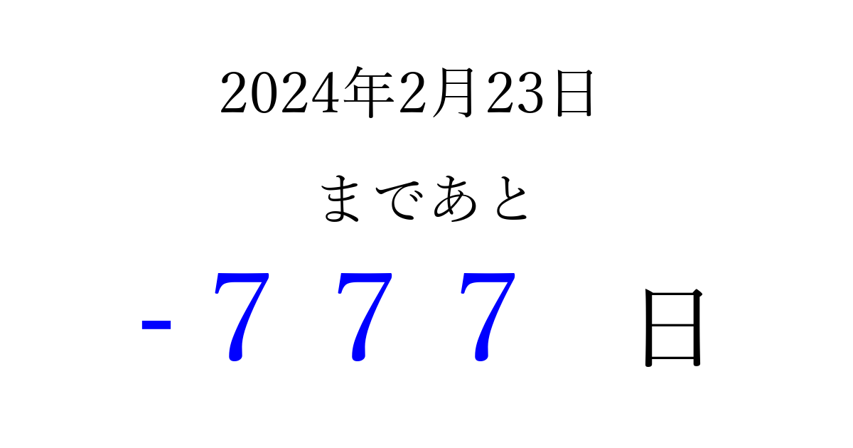 2024年2月23日(金)は もう 000 日過ぎました 追加すると、トップページからすぐ選べるようになります ※2026/04/10現在の結果です。 最新の状態に更新する ↓シェアして、タイムライン上にカウントダウンを表示しよう!↓ 📤 この結果を共有する Tweet シェア Threads Bluesky 別の日付でカウントダウン 2024年2月のカレンダー このページをブックマークに追加すると、いつでもカウントダウンを確認できます。 (PC: Ctrl+D / Mac: ⌘+D) hitome-notes.comでは以下のページも運営しています。 指定日と期間から日付を計算 | ガチャ確率計算・シミュレーション | プライバシー・ポリシー 運営者:Avocado