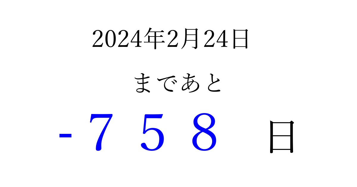 2024年2月24日(土)は もう 000 日過ぎました 追加すると、トップページからすぐ選べるようになります ※2026/03/23現在の結果です。 最新の状態に更新する ↓シェアして、タイムライン上にカウントダウンを表示しよう!↓ 📤 この結果を共有する Tweet シェア Threads Bluesky 別の日付でカウントダウン 2024年2月のカレンダー このページをブックマークに追加すると、いつでもカウントダウンを確認できます。 (PC: Ctrl+D / Mac: ⌘+D) hitome-notes.comでは以下のページも運営しています。 指定日と期間から日付を計算 | ガチャ確率計算・シミュレーション | プライバシー・ポリシー 運営者:Avocado