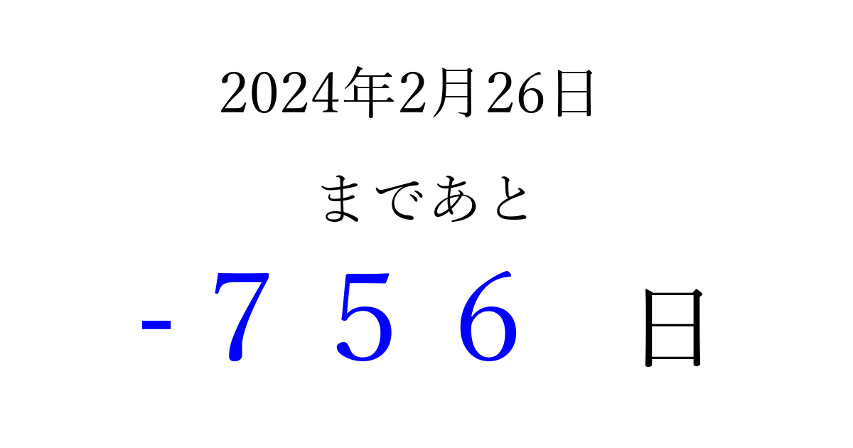 2024年2月26日(月)は もう 000 日過ぎました 追加すると、トップページからすぐ選べるようになります ※2026/03/23現在の結果です。 最新の状態に更新する ↓シェアして、タイムライン上にカウントダウンを表示しよう!↓ 📤 この結果を共有する Tweet シェア Threads Bluesky 別の日付でカウントダウン 2024年2月のカレンダー このページをブックマークに追加すると、いつでもカウントダウンを確認できます。 (PC: Ctrl+D / Mac: ⌘+D) hitome-notes.comでは以下のページも運営しています。 指定日と期間から日付を計算 | ガチャ確率計算・シミュレーション | プライバシー・ポリシー 運営者:Avocado