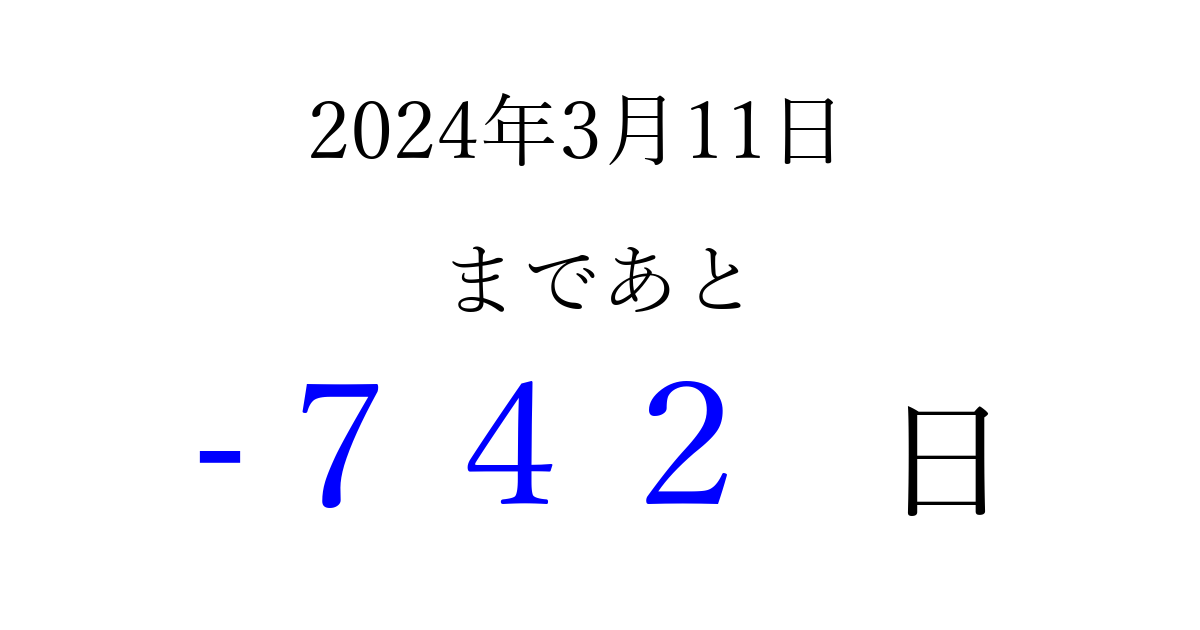2024年3月11日(月)は もう 000 日過ぎました 追加すると、トップページからすぐ選べるようになります ※2026/03/23現在の結果です。 最新の状態に更新する ↓シェアして、タイムライン上にカウントダウンを表示しよう!↓ 📤 この結果を共有する Tweet シェア Threads Bluesky 別の日付でカウントダウン 2024年3月のカレンダー このページをブックマークに追加すると、いつでもカウントダウンを確認できます。 (PC: Ctrl+D / Mac: ⌘+D) hitome-notes.comでは以下のページも運営しています。 指定日と期間から日付を計算 | ガチャ確率計算・シミュレーション | プライバシー・ポリシー 運営者:Avocado