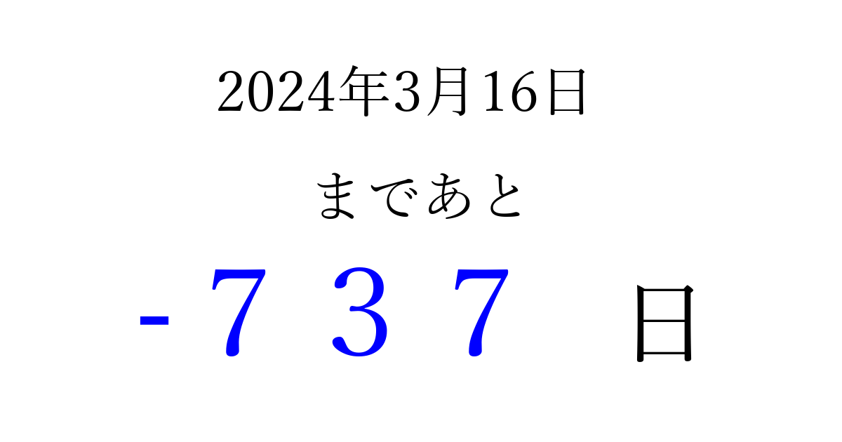 2024年3月16日(土)は もう 000 日過ぎました 追加すると、トップページからすぐ選べるようになります ※2026/03/23現在の結果です。 最新の状態に更新する ↓シェアして、タイムライン上にカウントダウンを表示しよう!↓ 📤 この結果を共有する Tweet シェア Threads Bluesky 別の日付でカウントダウン 2024年3月のカレンダー このページをブックマークに追加すると、いつでもカウントダウンを確認できます。 (PC: Ctrl+D / Mac: ⌘+D) hitome-notes.comでは以下のページも運営しています。 指定日と期間から日付を計算 | ガチャ確率計算・シミュレーション | プライバシー・ポリシー 運営者:Avocado