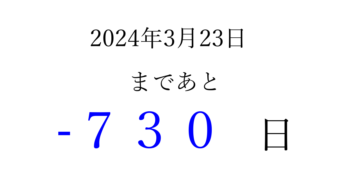 2024年3月23日(土)は もう 000 日過ぎました 追加すると、トップページからすぐ選べるようになります ※2026/03/23現在の結果です。 最新の状態に更新する ↓シェアして、タイムライン上にカウントダウンを表示しよう!↓ 📤 この結果を共有する Tweet シェア Threads Bluesky 別の日付でカウントダウン 2024年3月のカレンダー このページをブックマークに追加すると、いつでもカウントダウンを確認できます。 (PC: Ctrl+D / Mac: ⌘+D) hitome-notes.comでは以下のページも運営しています。 指定日と期間から日付を計算 | ガチャ確率計算・シミュレーション | プライバシー・ポリシー 運営者:Avocado