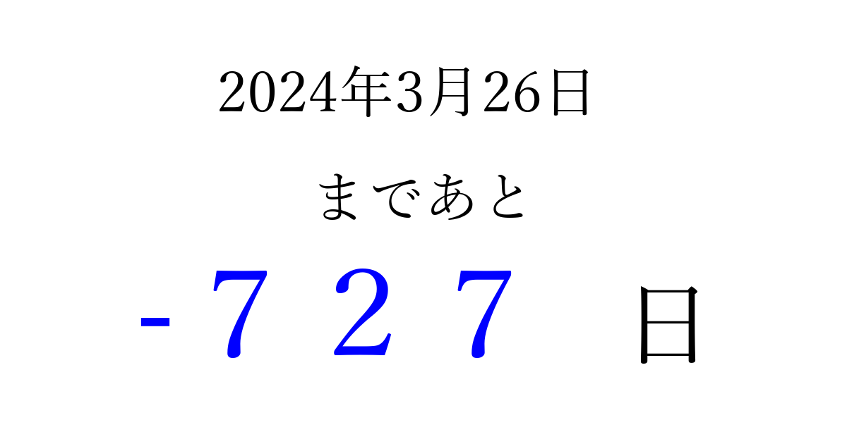 2024年3月26日(火)は もう 000 日過ぎました 追加すると、トップページからすぐ選べるようになります ※2026/03/23現在の結果です。 最新の状態に更新する ↓シェアして、タイムライン上にカウントダウンを表示しよう!↓ 📤 この結果を共有する Tweet シェア Threads Bluesky 別の日付でカウントダウン 2024年3月のカレンダー このページをブックマークに追加すると、いつでもカウントダウンを確認できます。 (PC: Ctrl+D / Mac: ⌘+D) hitome-notes.comでは以下のページも運営しています。 指定日と期間から日付を計算 | ガチャ確率計算・シミュレーション | プライバシー・ポリシー 運営者:Avocado
