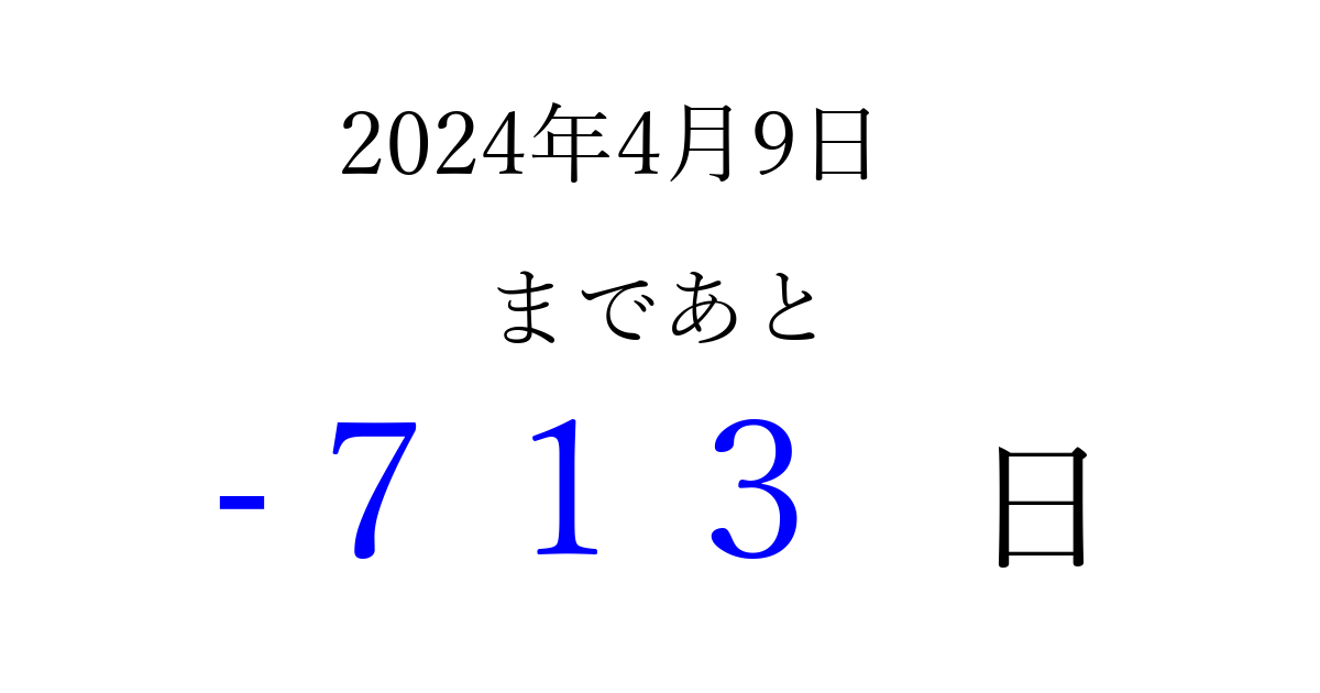 2024年4月9日(火)は もう 000 日過ぎました 追加すると、トップページからすぐ選べるようになります ※2026/03/23現在の結果です。 最新の状態に更新する ↓シェアして、タイムライン上にカウントダウンを表示しよう!↓ 📤 この結果を共有する Tweet シェア Threads Bluesky 別の日付でカウントダウン 2024年4月のカレンダー このページをブックマークに追加すると、いつでもカウントダウンを確認できます。 (PC: Ctrl+D / Mac: ⌘+D) hitome-notes.comでは以下のページも運営しています。 指定日と期間から日付を計算 | ガチャ確率計算・シミュレーション | プライバシー・ポリシー 運営者:Avocado