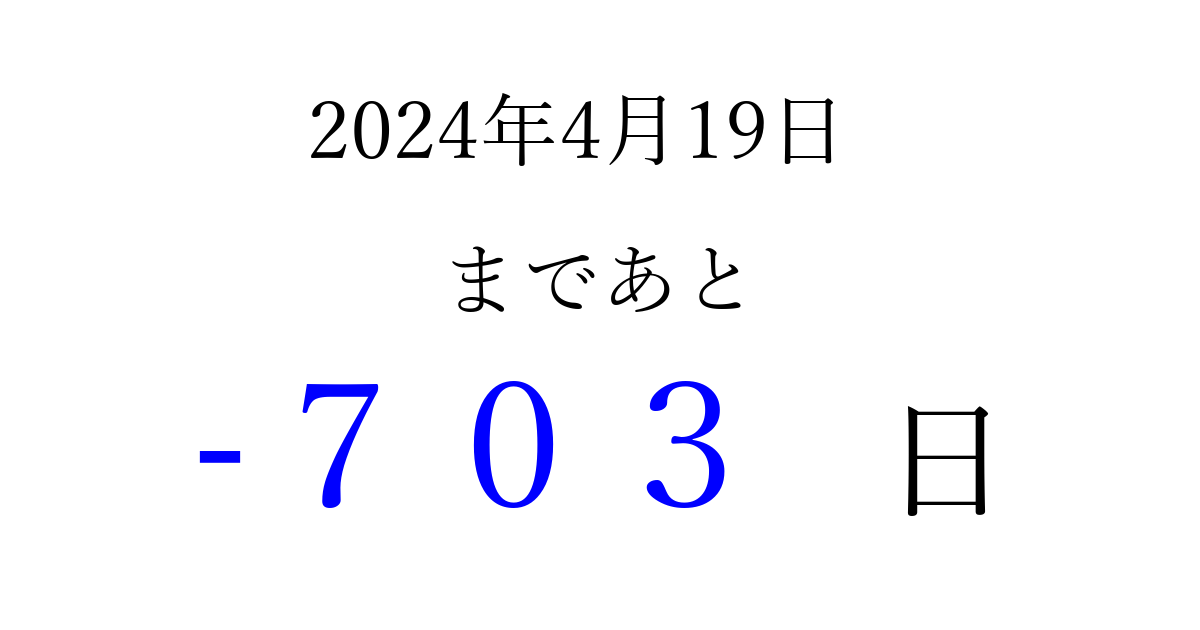 2024年4月19日(金)は もう 000 日過ぎました 追加すると、トップページからすぐ選べるようになります ※2026/03/23現在の結果です。 最新の状態に更新する ↓シェアして、タイムライン上にカウントダウンを表示しよう!↓ 📤 この結果を共有する Tweet シェア Threads Bluesky 別の日付でカウントダウン 2024年4月のカレンダー このページをブックマークに追加すると、いつでもカウントダウンを確認できます。 (PC: Ctrl+D / Mac: ⌘+D) hitome-notes.comでは以下のページも運営しています。 指定日と期間から日付を計算 | ガチャ確率計算・シミュレーション | プライバシー・ポリシー 運営者:Avocado