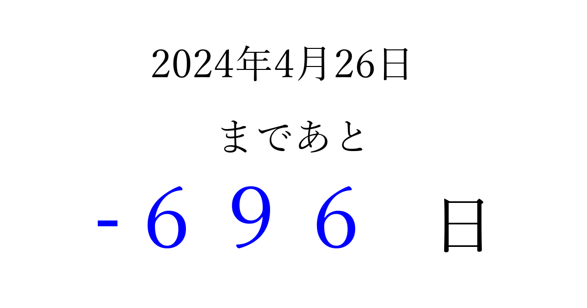 2024年4月26日(金)は もう 000 日過ぎました 追加すると、トップページからすぐ選べるようになります ※2026/03/23現在の結果です。 最新の状態に更新する ↓シェアして、タイムライン上にカウントダウンを表示しよう!↓ 📤 この結果を共有する Tweet シェア Threads Bluesky 別の日付でカウントダウン 2024年4月のカレンダー このページをブックマークに追加すると、いつでもカウントダウンを確認できます。 (PC: Ctrl+D / Mac: ⌘+D) hitome-notes.comでは以下のページも運営しています。 指定日と期間から日付を計算 | ガチャ確率計算・シミュレーション | プライバシー・ポリシー 運営者:Avocado