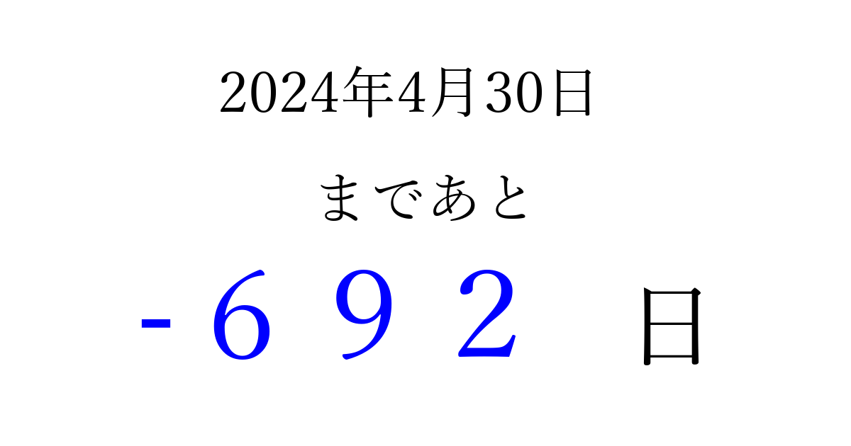 2024年4月30日(火)は もう 000 日過ぎました 追加すると、トップページからすぐ選べるようになります ※2026/03/23現在の結果です。 最新の状態に更新する ↓シェアして、タイムライン上にカウントダウンを表示しよう!↓ 📤 この結果を共有する Tweet シェア Threads Bluesky 別の日付でカウントダウン 2024年4月のカレンダー このページをブックマークに追加すると、いつでもカウントダウンを確認できます。 (PC: Ctrl+D / Mac: ⌘+D) hitome-notes.comでは以下のページも運営しています。 指定日と期間から日付を計算 | ガチャ確率計算・シミュレーション | プライバシー・ポリシー 運営者:Avocado