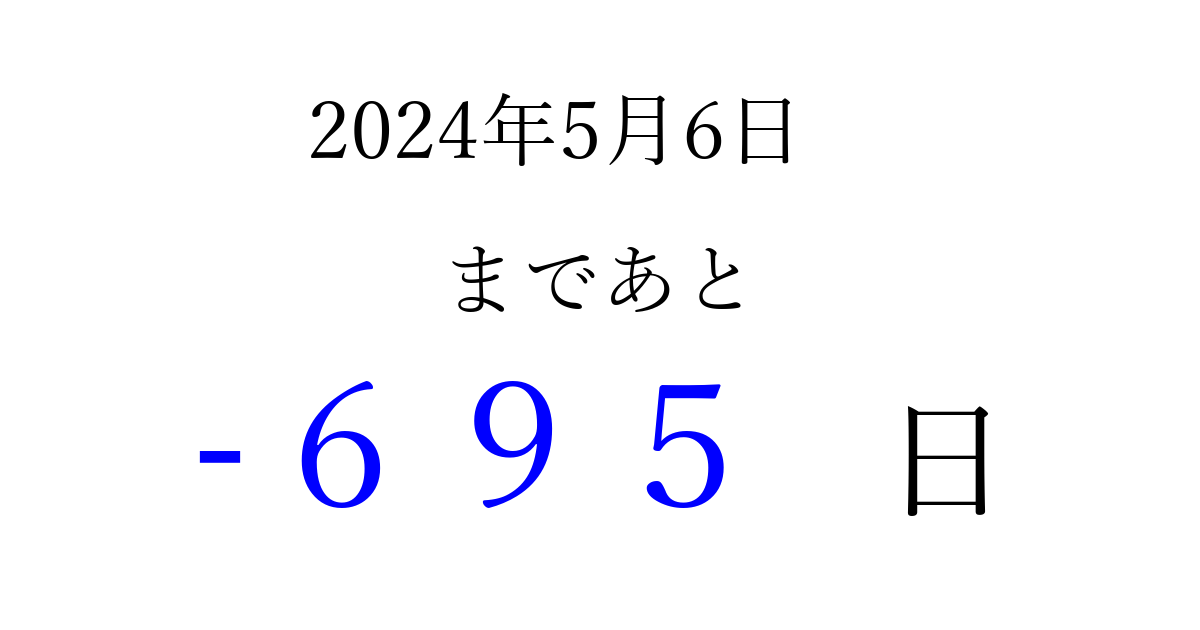 2024年5月6日(月)は もう 000 日過ぎました 追加すると、トップページからすぐ選べるようになります ※2026/04/01現在の結果です。 最新の状態に更新する ↓シェアして、タイムライン上にカウントダウンを表示しよう!↓ 📤 この結果を共有する Tweet シェア Threads Bluesky 別の日付でカウントダウン 2024年5月のカレンダー このページをブックマークに追加すると、いつでもカウントダウンを確認できます。 (PC: Ctrl+D / Mac: ⌘+D) hitome-notes.comでは以下のページも運営しています。 指定日と期間から日付を計算 | ガチャ確率計算・シミュレーション | プライバシー・ポリシー 運営者:Avocado