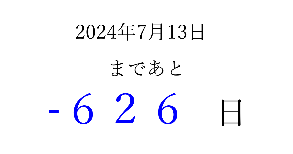 2024年7月13日(土)は もう 000 日過ぎました 追加すると、トップページからすぐ選べるようになります ※2026/03/31現在の結果です。 最新の状態に更新する ↓シェアして、タイムライン上にカウントダウンを表示しよう!↓ 📤 この結果を共有する Tweet シェア Threads Bluesky 別の日付でカウントダウン 2024年7月のカレンダー このページをブックマークに追加すると、いつでもカウントダウンを確認できます。 (PC: Ctrl+D / Mac: ⌘+D) hitome-notes.comでは以下のページも運営しています。 指定日と期間から日付を計算 | ガチャ確率計算・シミュレーション | プライバシー・ポリシー 運営者:Avocado