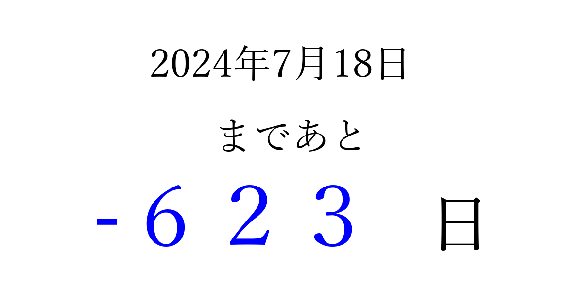2024年7月18日(木)は もう 000 日過ぎました 追加すると、トップページからすぐ選べるようになります ※2026/04/02現在の結果です。 最新の状態に更新する ↓シェアして、タイムライン上にカウントダウンを表示しよう!↓ 📤 この結果を共有する Tweet シェア Threads Bluesky 別の日付でカウントダウン 2024年7月のカレンダー このページをブックマークに追加すると、いつでもカウントダウンを確認できます。 (PC: Ctrl+D / Mac: ⌘+D) hitome-notes.comでは以下のページも運営しています。 指定日と期間から日付を計算 | ガチャ確率計算・シミュレーション | プライバシー・ポリシー 運営者:Avocado