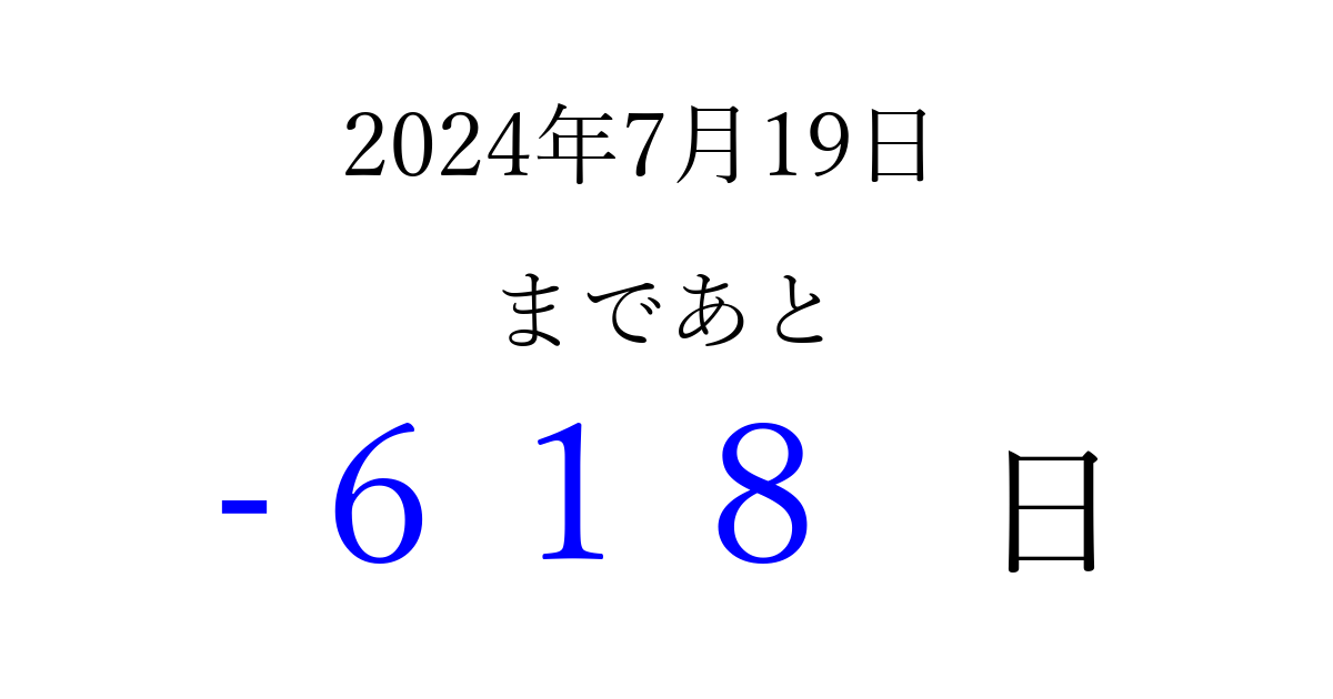 2024年7月19日(金)は もう 000 日過ぎました 追加すると、トップページからすぐ選べるようになります ※2026/03/29現在の結果です。 最新の状態に更新する ↓シェアして、タイムライン上にカウントダウンを表示しよう!↓ 📤 この結果を共有する Tweet シェア Threads Bluesky 別の日付でカウントダウン 2024年7月のカレンダー このページをブックマークに追加すると、いつでもカウントダウンを確認できます。 (PC: Ctrl+D / Mac: ⌘+D) hitome-notes.comでは以下のページも運営しています。 指定日と期間から日付を計算 | ガチャ確率計算・シミュレーション | プライバシー・ポリシー 運営者:Avocado