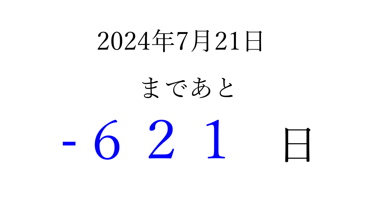 2024年7月21日(日)は もう 000 日過ぎました 追加すると、トップページからすぐ選べるようになります ※2026/04/03現在の結果です。 最新の状態に更新する ↓シェアして、タイムライン上にカウントダウンを表示しよう!↓ 📤 この結果を共有する Tweet シェア Threads Bluesky 別の日付でカウントダウン 2024年7月のカレンダー このページをブックマークに追加すると、いつでもカウントダウンを確認できます。 (PC: Ctrl+D / Mac: ⌘+D) hitome-notes.comでは以下のページも運営しています。 指定日と期間から日付を計算 | ガチャ確率計算・シミュレーション | プライバシー・ポリシー 運営者:Avocado