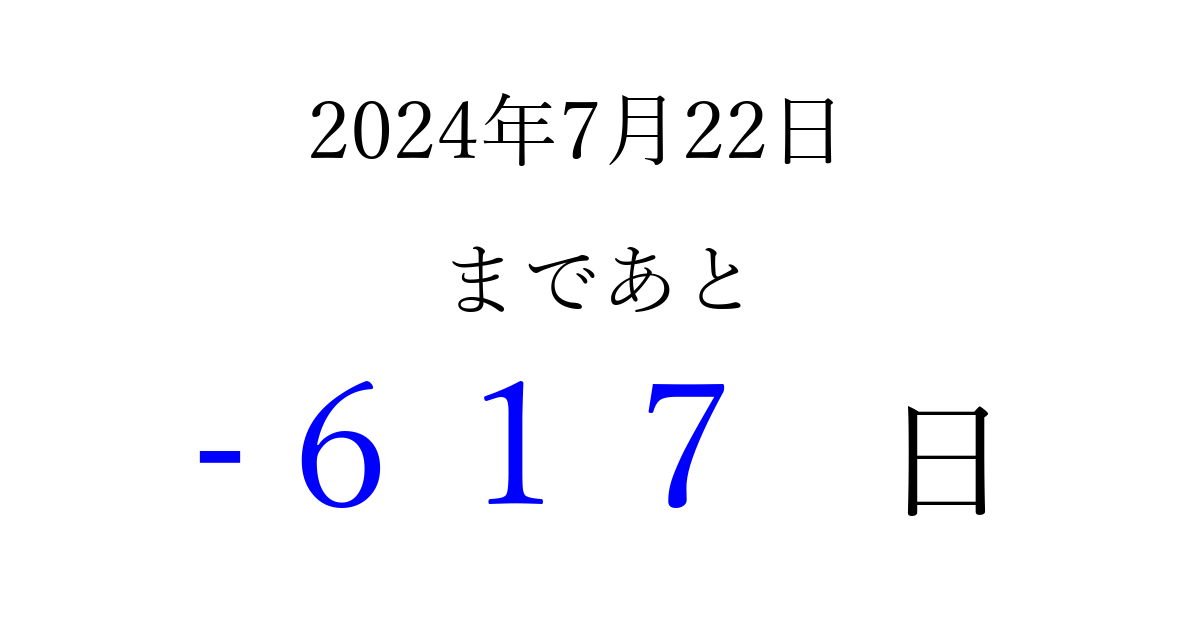 2024年7月22日(月)は もう 000 日過ぎました 追加すると、トップページからすぐ選べるようになります ※2026/03/31現在の結果です。 最新の状態に更新する ↓シェアして、タイムライン上にカウントダウンを表示しよう!↓ 📤 この結果を共有する Tweet シェア Threads Bluesky 別の日付でカウントダウン 2024年7月のカレンダー このページをブックマークに追加すると、いつでもカウントダウンを確認できます。 (PC: Ctrl+D / Mac: ⌘+D) hitome-notes.comでは以下のページも運営しています。 指定日と期間から日付を計算 | ガチャ確率計算・シミュレーション | プライバシー・ポリシー 運営者:Avocado