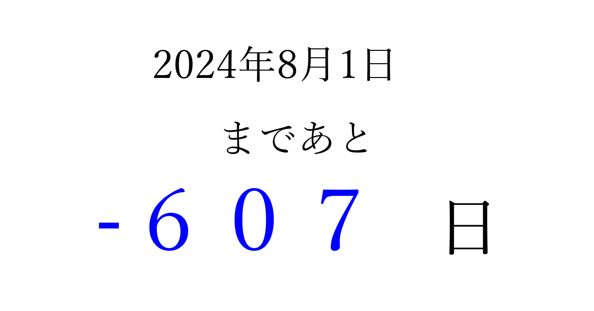 2024年8月1日(木)は もう 000 日過ぎました 追加すると、トップページからすぐ選べるようになります ※2026/03/31現在の結果です。 最新の状態に更新する ↓シェアして、タイムライン上にカウントダウンを表示しよう!↓ 📤 この結果を共有する Tweet シェア Threads Bluesky 別の日付でカウントダウン 2024年8月のカレンダー このページをブックマークに追加すると、いつでもカウントダウンを確認できます。 (PC: Ctrl+D / Mac: ⌘+D) hitome-notes.comでは以下のページも運営しています。 指定日と期間から日付を計算 | ガチャ確率計算・シミュレーション | プライバシー・ポリシー 運営者:Avocado