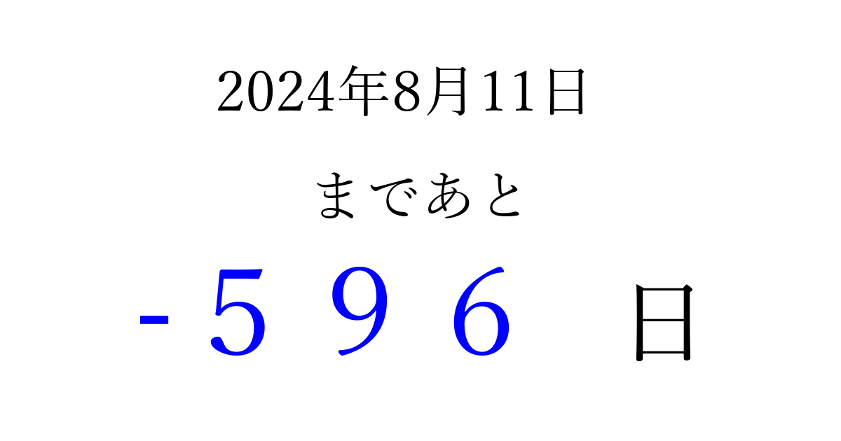 2024年8月11日(日)は もう 000 日過ぎました 追加すると、トップページからすぐ選べるようになります ※2026/03/30現在の結果です。 最新の状態に更新する ↓シェアして、タイムライン上にカウントダウンを表示しよう!↓ 📤 この結果を共有する Tweet シェア Threads Bluesky 別の日付でカウントダウン 2024年8月のカレンダー このページをブックマークに追加すると、いつでもカウントダウンを確認できます。 (PC: Ctrl+D / Mac: ⌘+D) hitome-notes.comでは以下のページも運営しています。 指定日と期間から日付を計算 | ガチャ確率計算・シミュレーション | プライバシー・ポリシー 運営者:Avocado