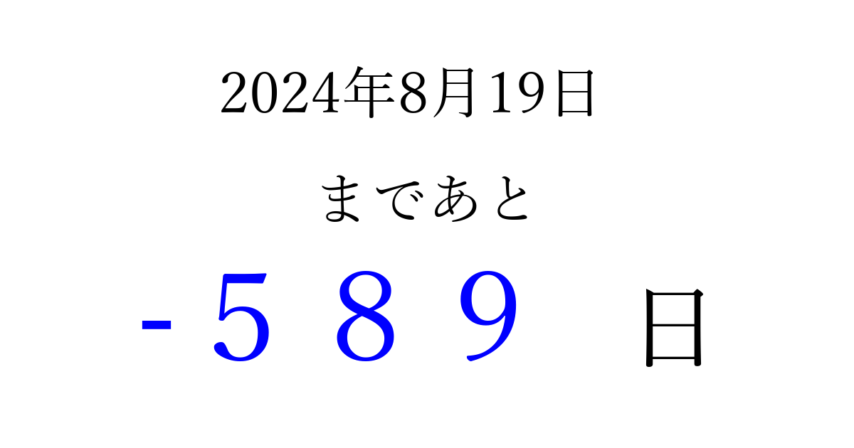 2024年8月19日(月)は もう 000 日過ぎました 追加すると、トップページからすぐ選べるようになります ※2026/03/31現在の結果です。 最新の状態に更新する ↓シェアして、タイムライン上にカウントダウンを表示しよう!↓ 📤 この結果を共有する Tweet シェア Threads Bluesky 別の日付でカウントダウン 2024年8月のカレンダー このページをブックマークに追加すると、いつでもカウントダウンを確認できます。 (PC: Ctrl+D / Mac: ⌘+D) hitome-notes.comでは以下のページも運営しています。 指定日と期間から日付を計算 | ガチャ確率計算・シミュレーション | プライバシー・ポリシー 運営者:Avocado