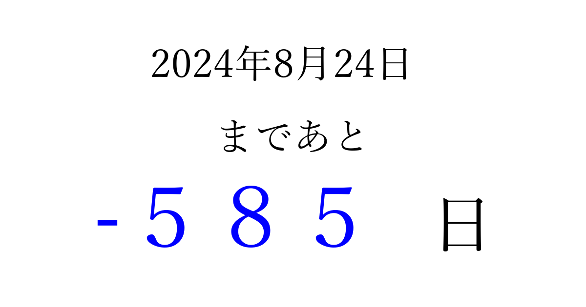 2024年8月24日(土)は もう 000 日過ぎました 追加すると、トップページからすぐ選べるようになります ※2026/04/01現在の結果です。 最新の状態に更新する ↓シェアして、タイムライン上にカウントダウンを表示しよう!↓ 📤 この結果を共有する Tweet シェア Threads Bluesky 別の日付でカウントダウン 2024年8月のカレンダー このページをブックマークに追加すると、いつでもカウントダウンを確認できます。 (PC: Ctrl+D / Mac: ⌘+D) hitome-notes.comでは以下のページも運営しています。 指定日と期間から日付を計算 | ガチャ確率計算・シミュレーション | プライバシー・ポリシー 運営者:Avocado