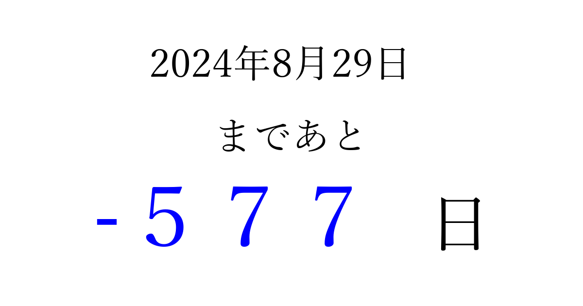 2024年8月29日(木)は もう 000 日過ぎました 追加すると、トップページからすぐ選べるようになります ※2026/03/29現在の結果です。 最新の状態に更新する ↓シェアして、タイムライン上にカウントダウンを表示しよう!↓ 📤 この結果を共有する Tweet シェア Threads Bluesky 別の日付でカウントダウン 2024年8月のカレンダー このページをブックマークに追加すると、いつでもカウントダウンを確認できます。 (PC: Ctrl+D / Mac: ⌘+D) hitome-notes.comでは以下のページも運営しています。 指定日と期間から日付を計算 | ガチャ確率計算・シミュレーション | プライバシー・ポリシー 運営者:Avocado