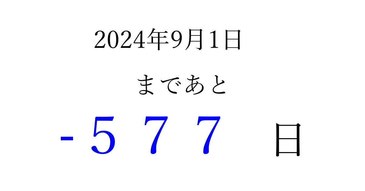 2024年9月1日(日)は もう 000 日過ぎました 追加すると、トップページからすぐ選べるようになります ※2026/04/01現在の結果です。 最新の状態に更新する ↓シェアして、タイムライン上にカウントダウンを表示しよう!↓ 📤 この結果を共有する Tweet シェア Threads Bluesky 別の日付でカウントダウン 2024年9月のカレンダー このページをブックマークに追加すると、いつでもカウントダウンを確認できます。 (PC: Ctrl+D / Mac: ⌘+D) hitome-notes.comでは以下のページも運営しています。 指定日と期間から日付を計算 | ガチャ確率計算・シミュレーション | プライバシー・ポリシー 運営者:Avocado
