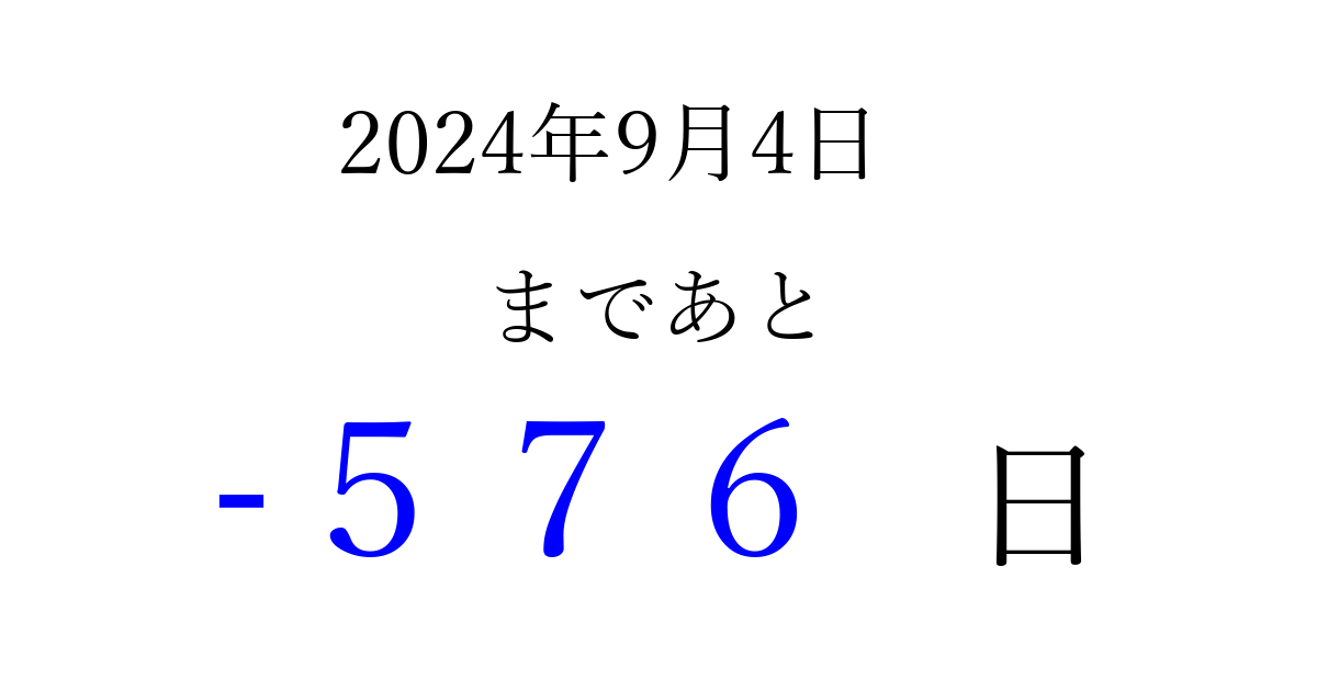 2024年9月4日(水)は もう 000 日過ぎました 追加すると、トップページからすぐ選べるようになります ※2026/04/03現在の結果です。 最新の状態に更新する ↓シェアして、タイムライン上にカウントダウンを表示しよう!↓ 📤 この結果を共有する Tweet シェア Threads Bluesky 別の日付でカウントダウン 2024年9月のカレンダー このページをブックマークに追加すると、いつでもカウントダウンを確認できます。 (PC: Ctrl+D / Mac: ⌘+D) hitome-notes.comでは以下のページも運営しています。 指定日と期間から日付を計算 | ガチャ確率計算・シミュレーション | プライバシー・ポリシー 運営者:Avocado